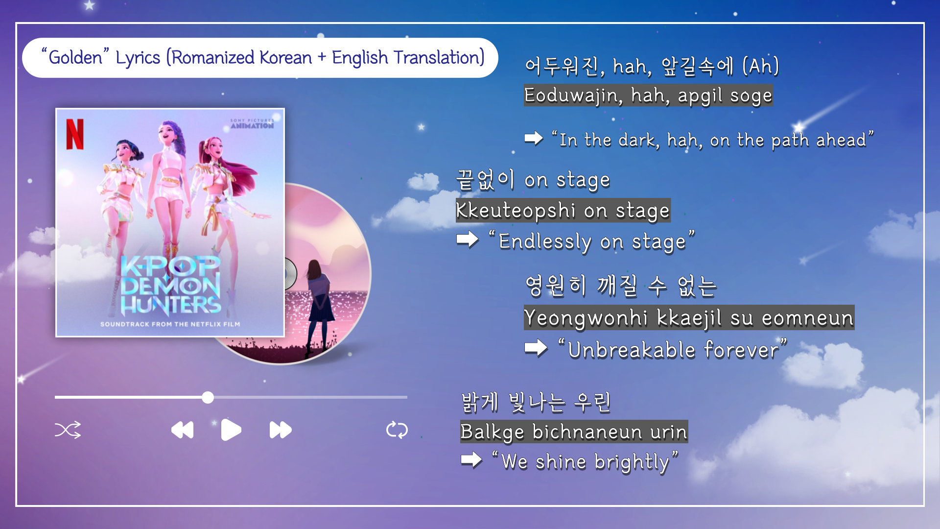 The soundtrack has become a sensation, especially the track “Golden”, which combines K-pop energy, electronic beats, and orchestral grandeur. With lyrics that mix English and Korean, the song perfectly reflects strength, resilience, and identity.