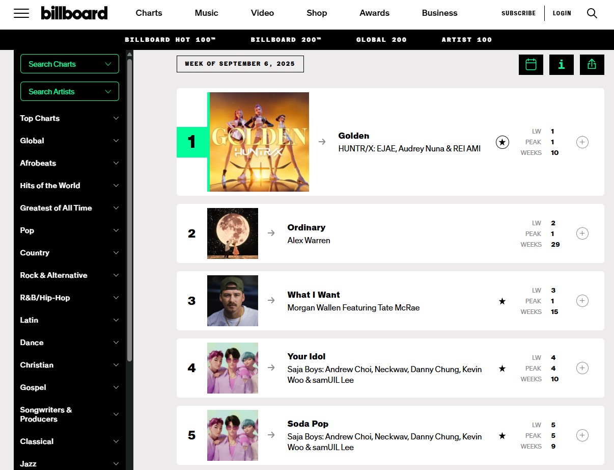 The popularity of K-Pop Demon Hunters is still going strong in 2025. As of September 8, 2025, on the Billboard Hot 100, the track “Golden” by HUNTR/X holds the No. 1 spot, followed by Saja Boys’ “Your Idol” at No. 4, and “Soda Pop” at No. 5.