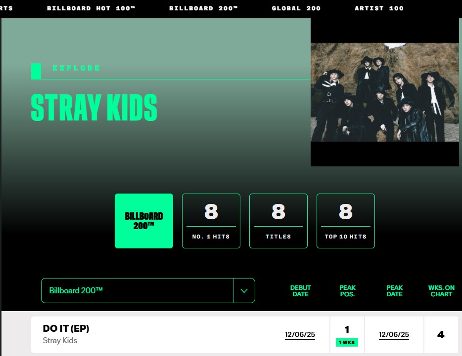 “Do It” debuted at No. 1 on the Billboard 200, making Stray Kids the first artist in Billboard history to debut eight consecutive albums at No. 1.
